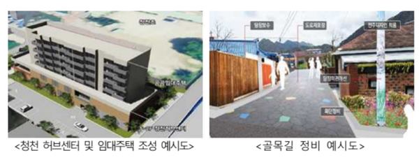 인구 감소로 쇠퇴를 겪고 있는 괴산군 청천면에는 2025년까지 188억원이 투입될 예정이며 괴산군은 귀농 · 귀촌인, 다자녀 가구 등을 위한 공공임대주택 20호를 공급하고 , 주민 커뮤니티공간과 돌봄센터가 복합된 거점공간인 청천허브센트럴 조성하여 귀농 ·귀촌 정착 프로그램을 운영할 예정입니다.