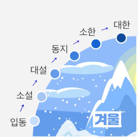농경생활을 하던 우리나라는 계절 변화를 중요하게 생각하여 한해를 24절기로 나눠 생활했습니다. 입춘부터 시작하는 24절기는 사계절로 나뉘어서 한 계절에 여섯 번의 절기로 나뉘며 겨울은 입동, 소설, 대설, 동지, 소한, 대한 순입니다.